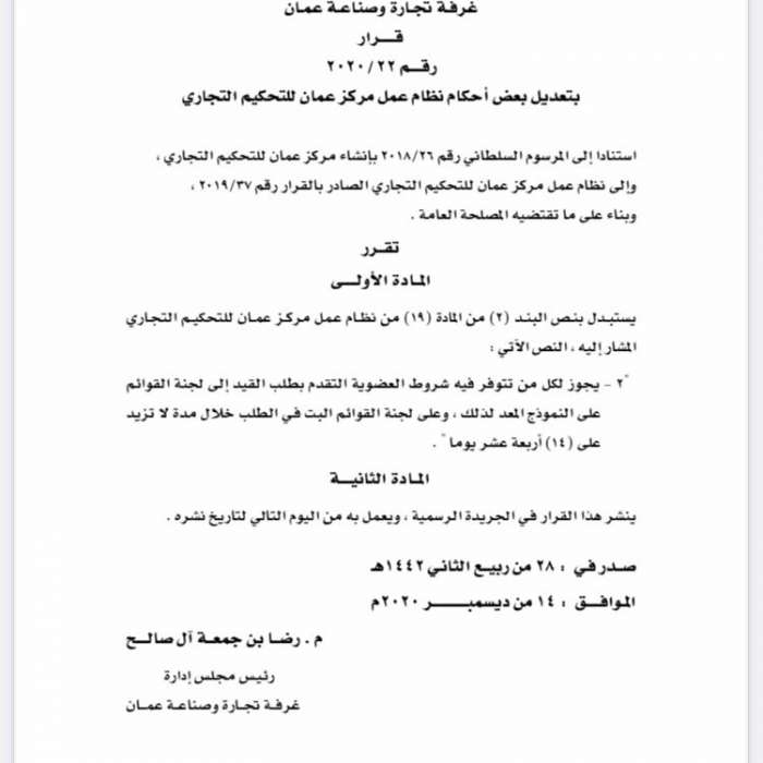 قرار بتعديل بعض أحكام نظام عمل مركز عمان للتحكيم التجاري