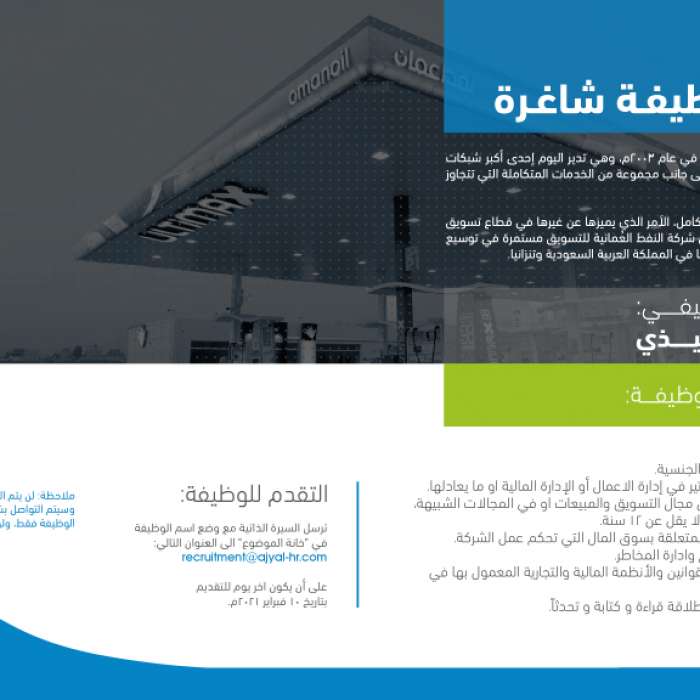 أعلنت شركة نفط عمان للتسويق عن وظيفة الرئيس التنفيذي للشركة حسب الشروط الواردة في الإعلان المرفق، فعلى الراغبين في التقدم والمستوفين لشروط شغل الوظيفة إرسال السيرة الذاتية إلى العنوان المذكور في الإعلان.