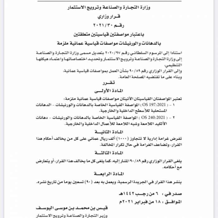 أصدر معالي قيس بن محمد بن موسى اليوسف وزير التجارة والصناعة وترويج الاستثمار قرارًا وزاريًا رقم 2021/30 باعتبار مواصفتين قياسيتين متعلقتين بالدهانات والورنيشات مواصفات قياسية عمانية ملزمة.