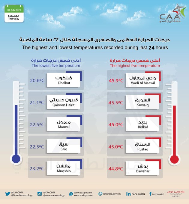 ذكرت الأرصاد الجوية العمانية في حسابها الرسمي عبر موقع "تويتر" درجات الحرارة العظمى والصغرى المسجلة خلال 24 ساعة الماضية.