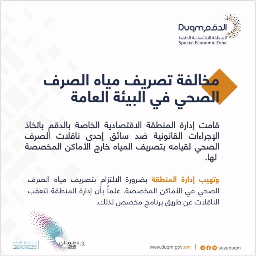 قامت المنطقة الاقتصادية الخاصة بالدقم باتخاذ الإجراءات القانونية ضد إحدى ناقلات الصرف الصحي لقيامها بتصريف المياه خارج الأماكن المخصصة لذلك.