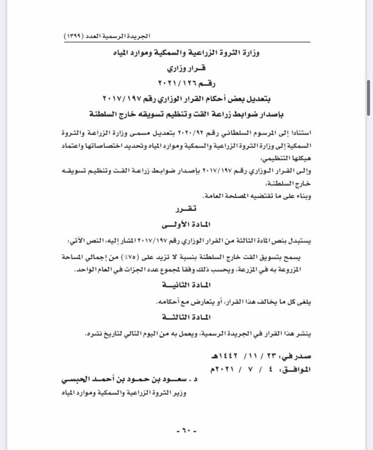 أصدر وزير الثروة الزراعية والسمكية وموارد المياة الدكتور سعود بن حمود الحبسي قراراً وزارياً بشان تعديل أحكام القرارة الوزاري رقم 197/2017 بإصدار ضوابط زراعة القت وتنظيم تسويقه خارج السلطنة .
