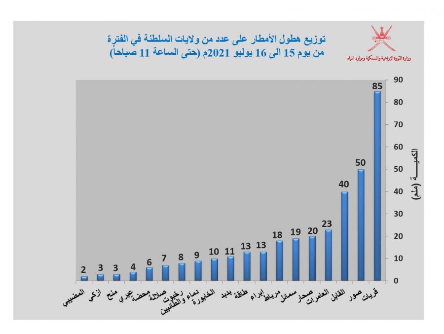 ‏‏وفي ما يلي إليكم تـوزيـع هطول الأمطار على عدد من ولايات السلطنة خلال الفترة من 15 يوليو إلـى 16 يوليو 2021م. ( حتى الساعة 11 صباحاً ).