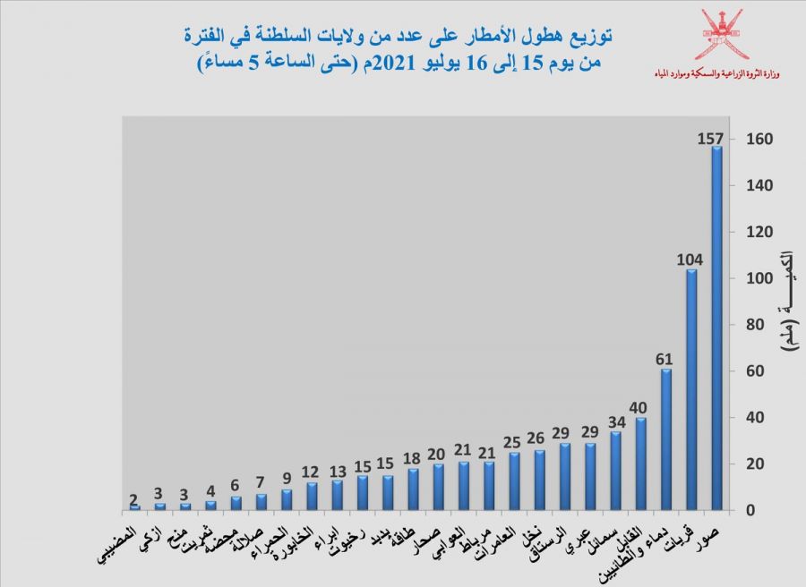 تصدرت ولاية صور كمية هطول الأمطار في آخر تحديث نشرته وزارة الثروة الزراعية والسمكية وموارد المياه، خلال الفترة من 15 يوليو إلـى 16 يوليو 2021م (حتى الساعة 5 مساءً) بـ 157 ملم، تلتها ولاية قريات بـ 104 ملم، ثم دماء والطائيين بـ 61 ملم.