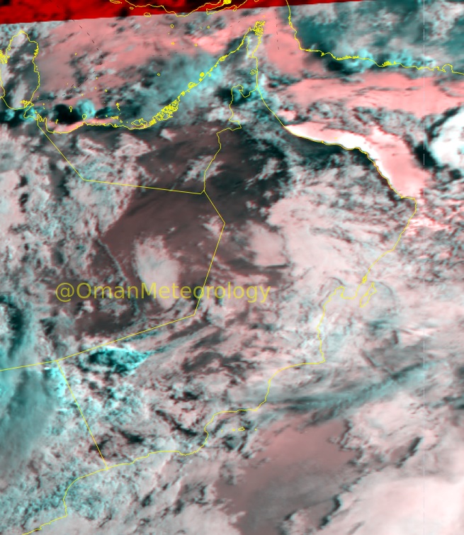 ‏وتظهر الصورة الجوية سحبًا متفاوتة الأرتفاع على معظم أجواء السلطنة مع استمرار هطول أمطار متفاوتة الغزارة على أجزاء من محافظتي شمال الباطنة وظفار.