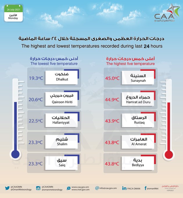 ووأضحت الأرصاد أن أعلى درجة حرارة سجلت في السنينة وبلغت 45 درجة سيليزية ، فيما سجلت ضلكوت أدنى درجة حرارة وبلغت 19.3 درجة سيليزية.