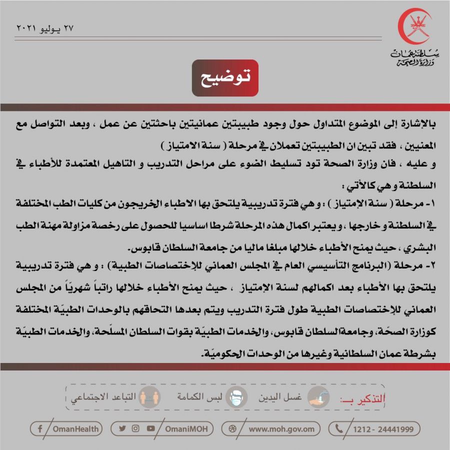 بالإشارة إلى الموضوع المتداول في وسائل التواصل الاجتماعي حول وجود طبيبتين عمانيتين باحثتين عن عمل ، فإن وزارة الصحة تود التوضيح بالآتي: