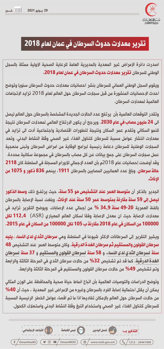 أفاد تقرير مُعدلات حدوث مرض السرطان في السلطنة لعام ٢٠١٨ أن إجمالي الحالات المُسجلة في السلطنة بلغ ٢١١٨ حالة حيث بلغ عدد العمانيين المصابين بالسرطان ١٩١١، بينهم ٨٣٦ من الذكور و١٠٧٥ من الإناث.