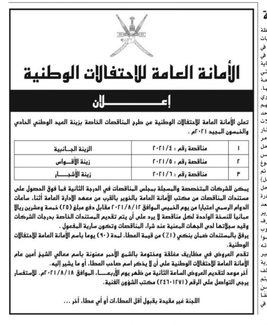 أعلنت الأمانة العامة اللاحتفالات الوطنية عن طرح المناقاصات الخاصة بزينة العيد الوطني الحادي والخمسون المجيد2021م ،وكانت المناقصات كالآتي: