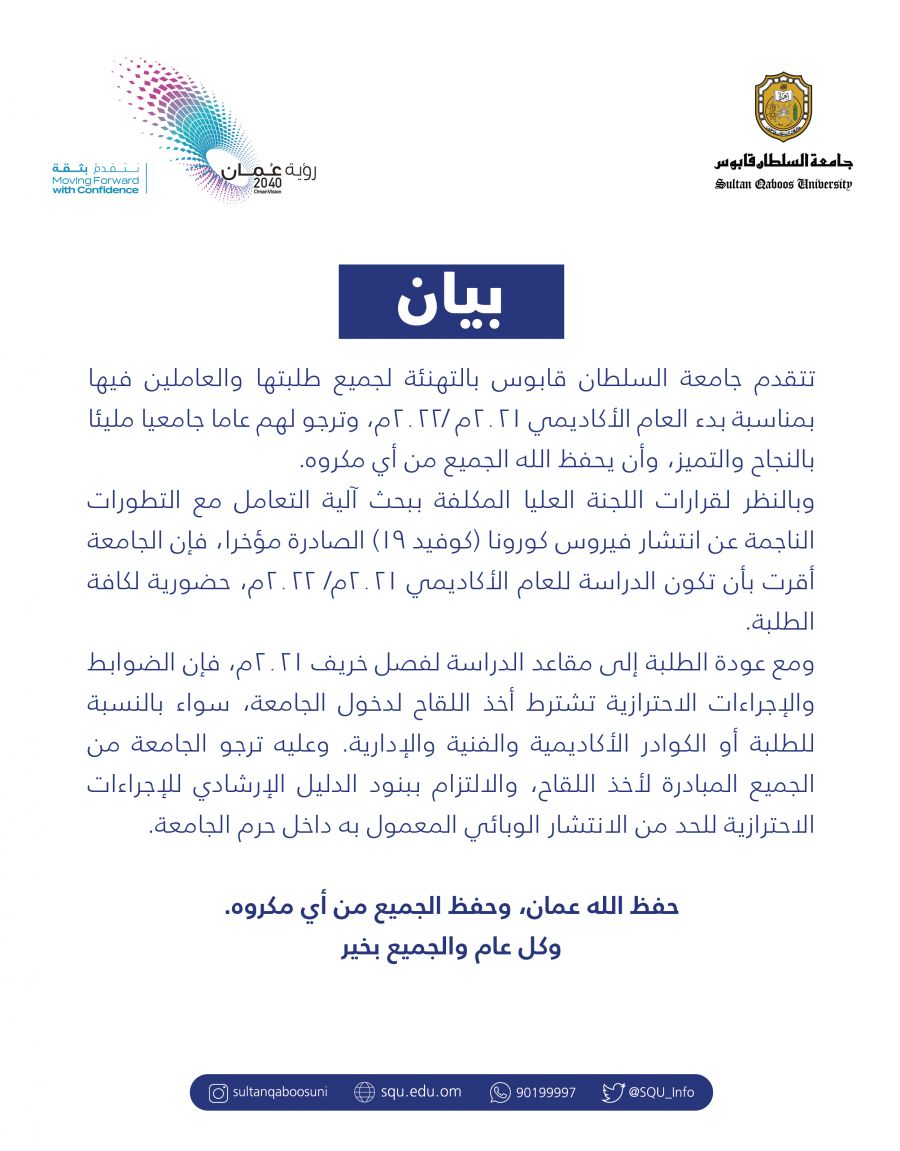 أصدرت جامعة السلطان قابوس بيانا قالت فيه أنّ الدراسة للعام الأكاديمي 2021/ 2022م ستكون حضورية لكافة الطلبة وستبدأ بتاريخ 5 سبتمبر المقبل.