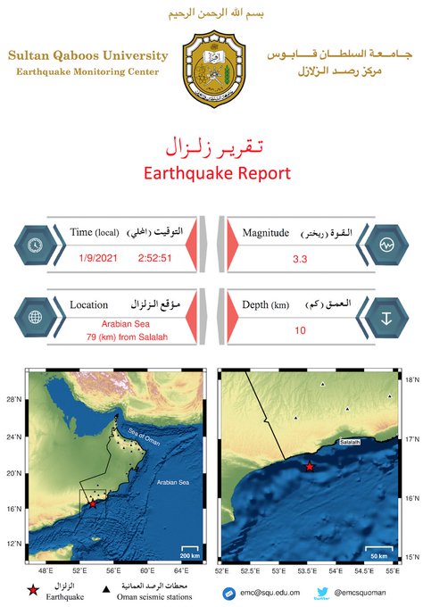 أعلن مركز رصد الزلازل بجامعة السلطان قابوس في حسابه الرسمي عبر موقع "تويتر" عن وقوع زلزال بقوة 3.3 في بحر العرب.