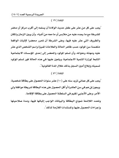 يجب على كل من عثر على طفل حديث الولادة أن يسلمه إلى أقرب مركز أو مخفر للشرطة مع ما يجده عليه من ملابس أو ما معه من أشياء وأن يبين الزمان والمكان والظروف التي عثر عليه فيها.