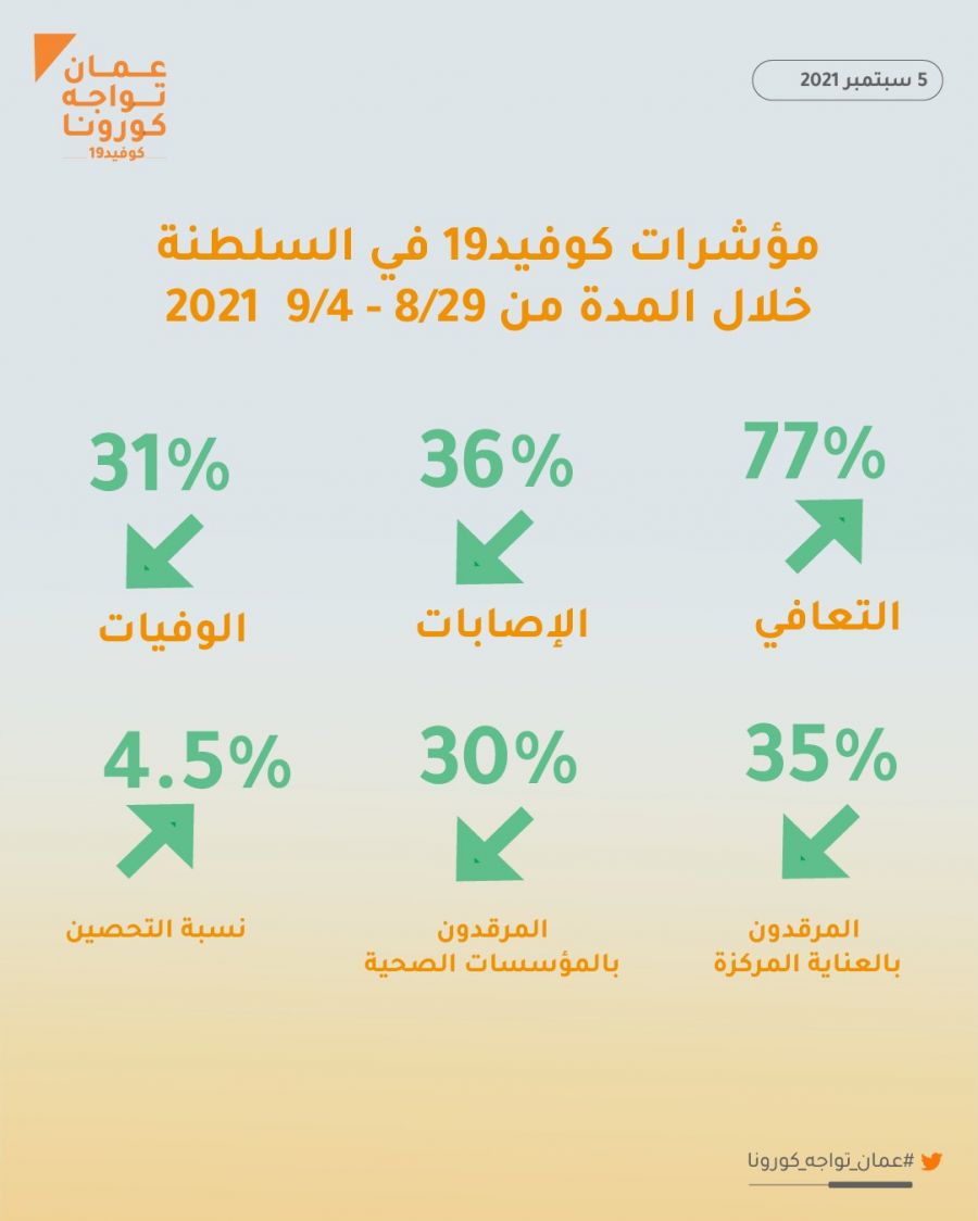 أشار الحساب الرسمي لعمان تواجه كورونا إلى تحسن مؤشرات الوضع الوبائي لكورونا في السلطنة، وتسجيل انخفاض في معدلات الإصابة ودخول المستشفيات وانخفاض في حالات الوفاة ، خلال المدة من 29 أغسطس - 4 سبتمبر 2021.