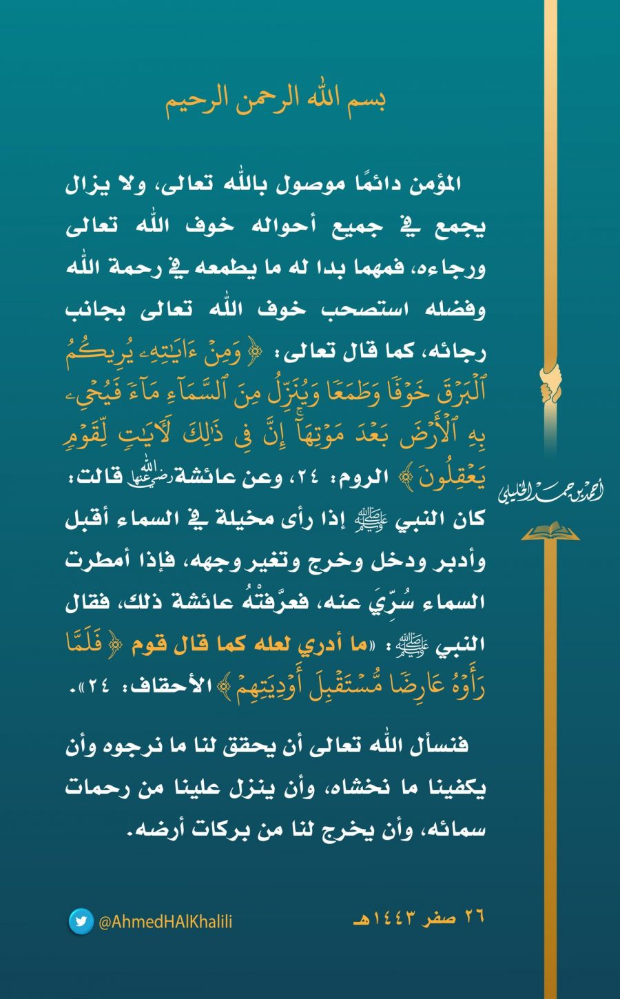 قال سماحة الشيخ أحمد بن حمد الخليلي المفتي العام للسلطنة في كلمة له حول الحالة المدارية شاهين أن المؤمن دائمًا موصول باللّٰه تعالى، ولا يزال يجمع في جميع أحواله خوفَ اللّٰه تعالى ورجاءَه، فمهما بدا له ما يطمعه في رحمة اللّٰه وفضله استصحب خوف اللّٰه تعالى بجانب رجائه.