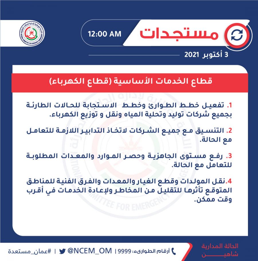 قالت اللجنة الوطنية لإدارة الحالات الطارئة أنه تم رفع مستوى الجاهزية وتفعيل خطط الطوارئ وخطط الاستجابة للحالات الطارئة بجميع شركات توليد و تحلية المياه ونقل وتوزيع الكهرباء.