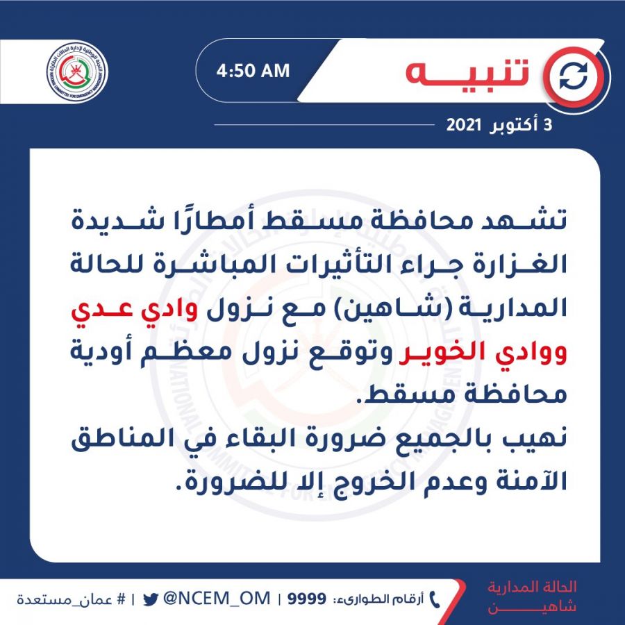 قالت اللجنة الوطنية للتعامل مع الحالات الطارئة أن محافظة مسقط تشهد أمطارًا شديدة الغزارة ونزول عدد من الأودية جراء التأثيرات المباشرة للحالة المدارية شاهين.