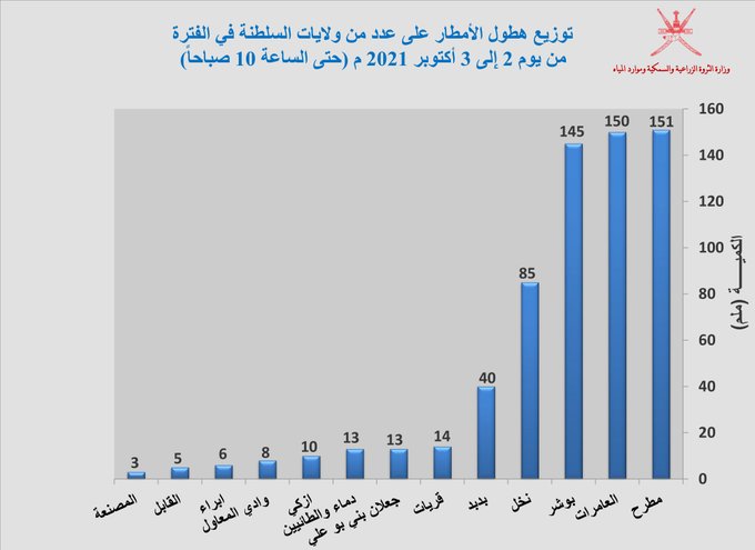 كشفت وزارة الثروة الزراعية والسمكية وموارد المياه عن تـوزيـع هطول الأمطار على عدد من ولايات السلطنة خلال الفترة من 2 - 3 أكتوبر 2021م ( حتى الساعة 10 صباحاً )، الموضحة في المرفق الآتي: