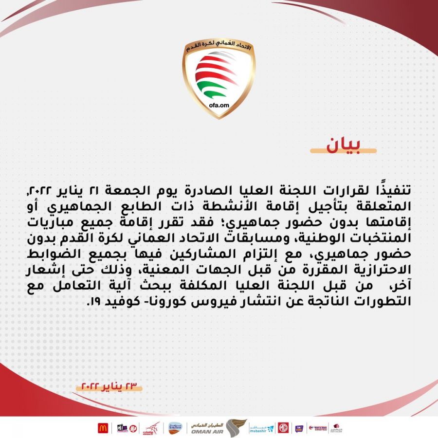 تنفيذاً لقرارات اللجنة العليا، تقرر إقامة مباريات المنتخبات الوطنية ومسابقات الاتحاد العُماني لكرة القدم بدون حضور جماهيري، حتى إشعار آخر: