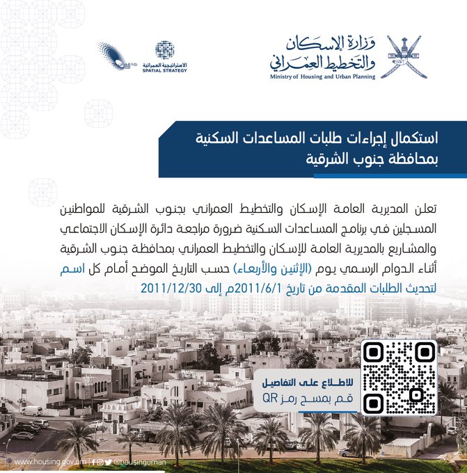 أصدرت وزارة الإسكان والتخطيط العمراني إعلان للمسجلين في برنامج المساعدات السكنية بمحافظة جنوب الشرقية لمراجعة دائرة الإسكان الاجتماعي والمشاريع لتحديث بيانات الطلبات خلال الفترة المحددة.