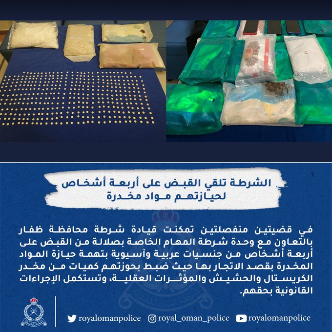 قيادة شرطة محافظة ظفار بالتعاون مع وحدة شرطة المهام الخاصة بصلالة تلقي القبض على أشخاص من جنسيات عربية وآسيوية لحيازتهم مواد مخدرة.