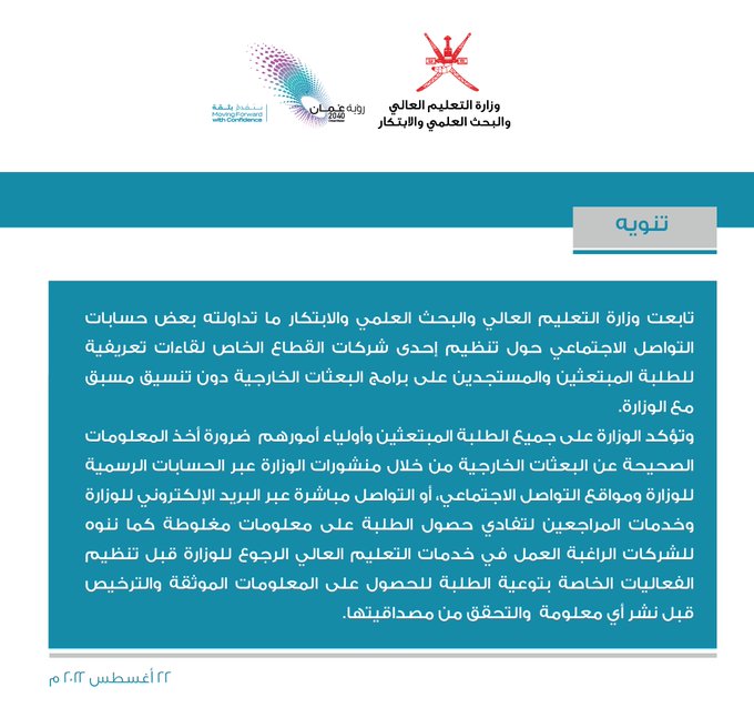 وأكدت الوزارة على جميع الطلبة المبتعثين وأولياء أمورهم ضرورة أخذ المعلومات الصحيحة عن البعثات الخارجية من خلال منشوراتها عبر الحسابات الرسمية ومواقع التواصل الاجتماعي، أو التواصل مباشرة عبر البريد الإلكتروني لها وخدمات المراجعين؛ لتفادي حصول الطلبة على معلومات مغلوطة.ونبّهت الوزارة الشركات الراغبة في العمل بخدمات التعليم العالي بضرورة الرجوع إليها قبل تنظيم الفعاليات الخاصة بتوعية الطلبة للحصول على المعلومات الموثقة والترخيص قبل نشر أي معلومة والتحقق من مصداقيتها.