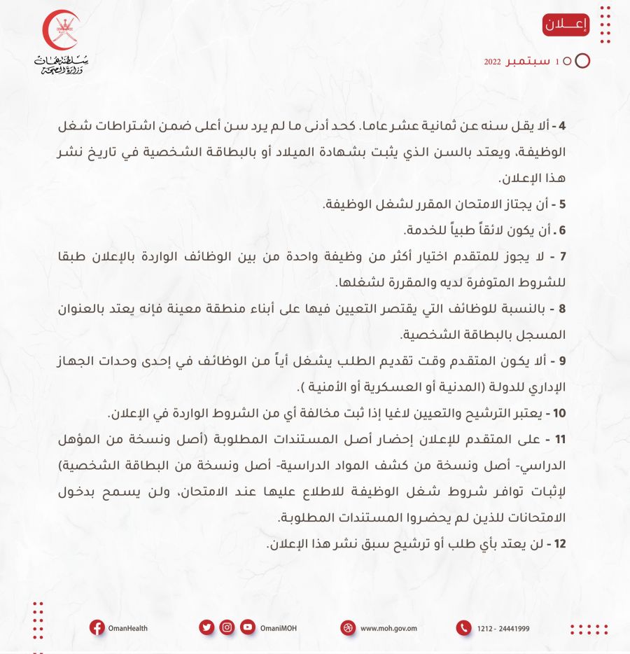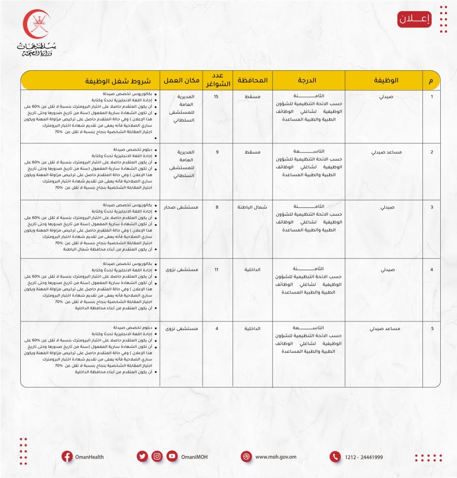 تعلن وزارة الصحة بالتنسيق مع وزارة العمل عن توفر عدد ( 47 ) وظيفة شاغرة ( صيدلي – مساعد صيدلي ) فعلـى مـن يجـد فـي نفسـه الرغبـة لشـغل إحـدى هذه الوظائـف مراجعة ديوان عام وزارة الصحة خلال ساعات الدوام الرسمي اعتباراً من يوم الأحد الموافق 04/ 09/ 2022م.