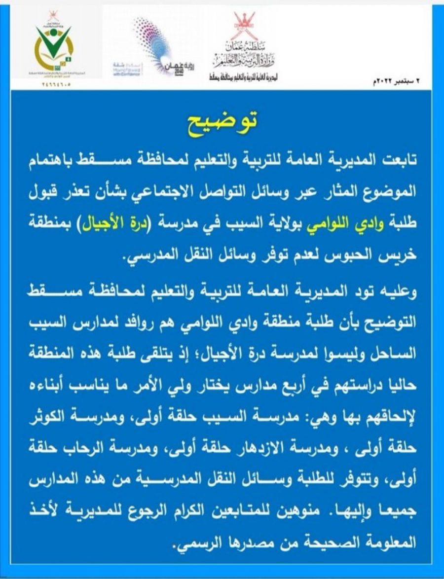 توضيح حول تعذر قبول الطلبة بمدرسة في ولاية السيب