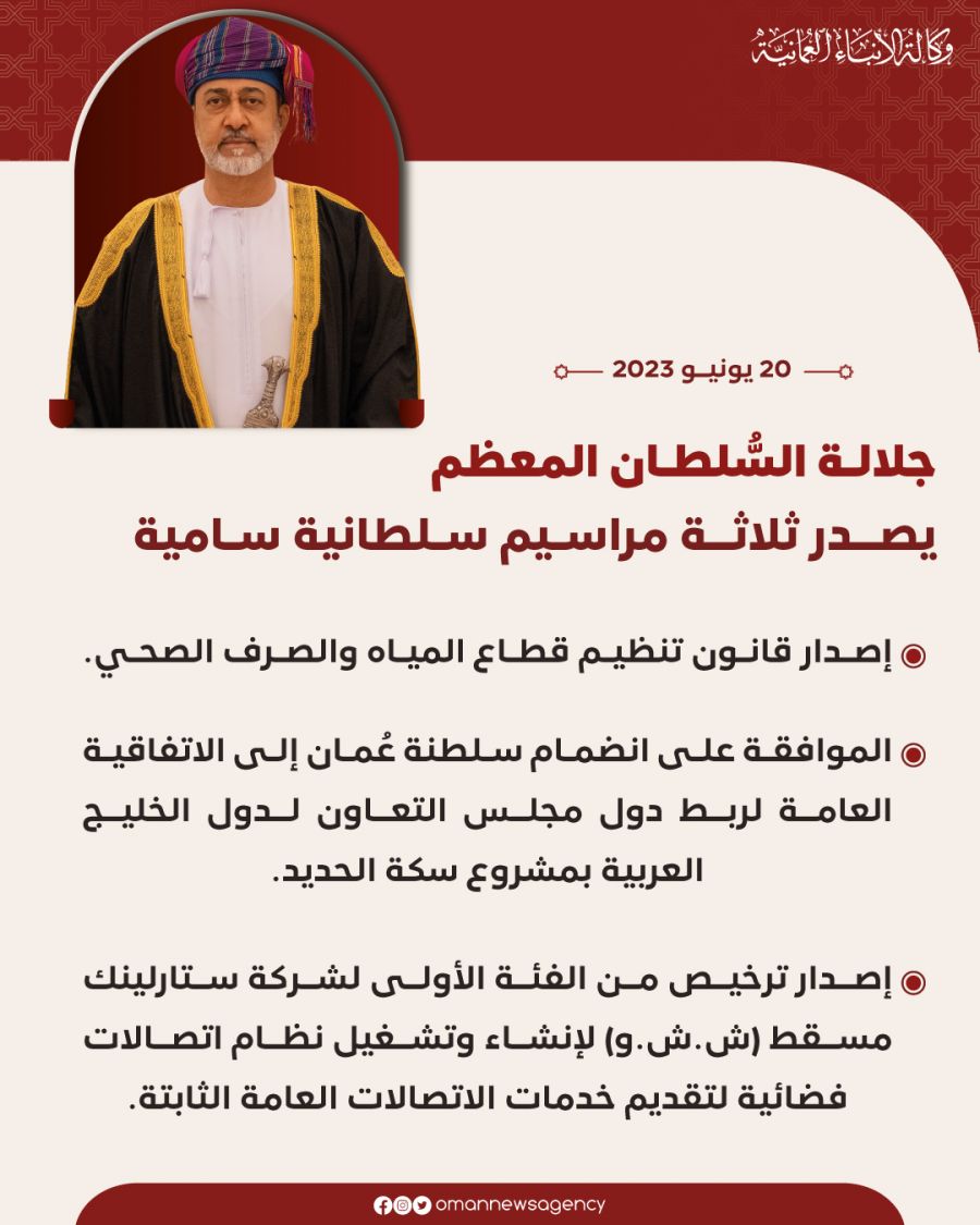 أصدر جلالة السُّلطان المعظّم هيثم بن طارق - حفظه الله ورعاه -  منذ قليل ثلاثة مراسيم سُلطانية، من بينهم قانون تنظيم قطاع المياه والصرف الصحي.
