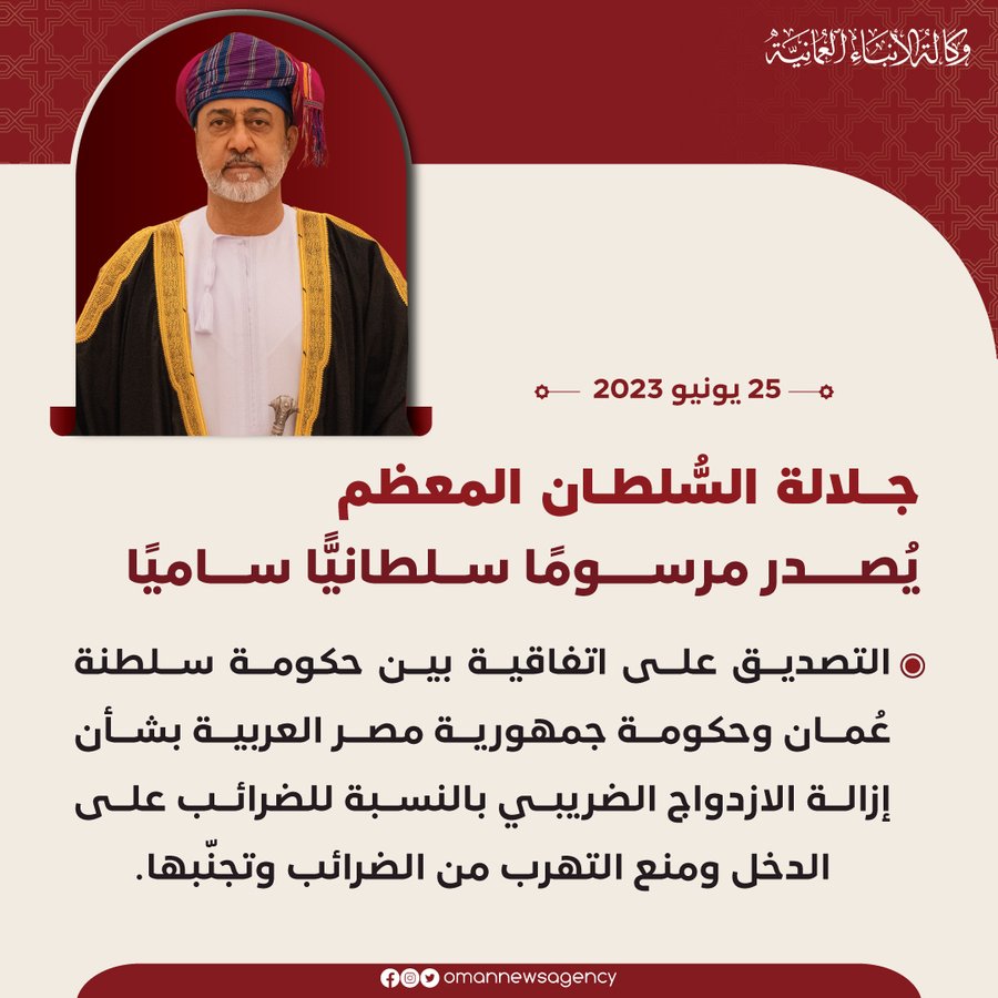 وجاء في المرسوم السامي التصديق على اتفاقية بين حكومة سلطنة عمان وجمهورية مصر العربية بشأن الازدواج الضريبي بالنسبة للضرائب على الدخل ومنع التهرب من الضرائب وتجنبها.