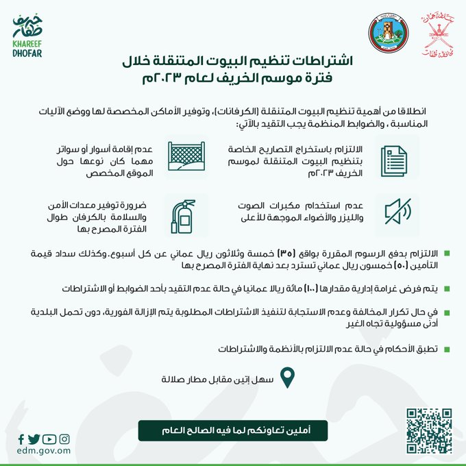 أعلنت بلدية ظفار في حسابها الرسمي عبر موقع "تويتر" عن اشتراطات تنظيم البيوت المتنقلة خلال فترة موسم الخريف لعام ٢٠٢٣م.