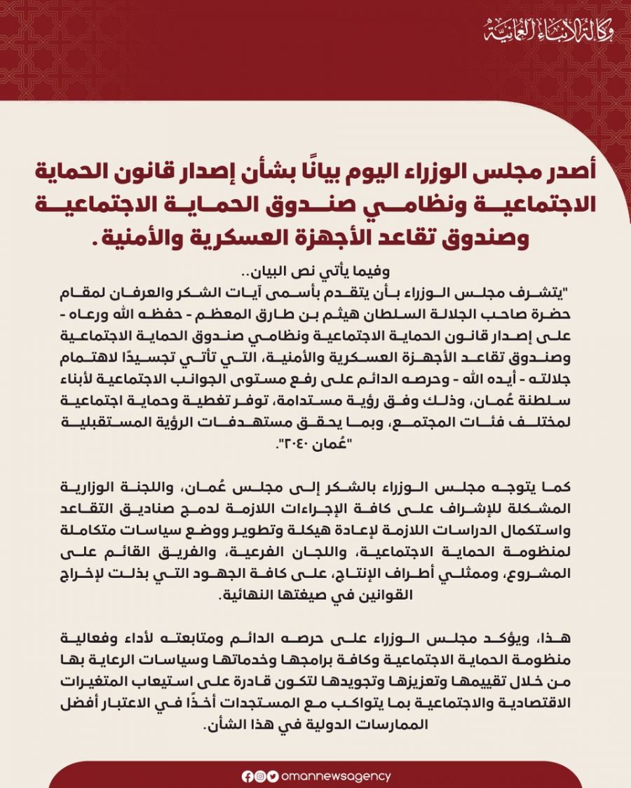 "يتشرف مجلس الوزراء بأن يتقدم بأسمى آيات الشكر والعرفان لمقام حضرة صاحب الجلالة السلطان هيثم بن طارق المعظم - حفظه الله ورعاه - على إصدار قانون الحماية الاجتماعية ونظامي صندوق الحماية الاجتماعية وصندوق تقاعد الأجهزة العسكرية والأمنية، التي تأتي تجسيدًا لاهتمام جلالته - أيده الله - وحرصه الدائم على رفع مستوى الجوانب الاجتماعية لأبناء سلطنة عُمان، وذلك وفق رؤية مستدامة، توفر تغطية وحماية اجتماعية لمختلف فئات المجتمع، وبما يحقق مستهدفات الرؤية المستقبلية "عُمان ٢٠٤٠".