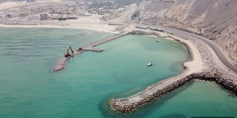 تواصل وزارة الثروة الزراعية والسمكية وموارد المياه الأعمال الإنشائية لمشروع كواسر الأمواج بقريتي الجري والغمضاء بولاية بخاء بمحافظة مسندم.