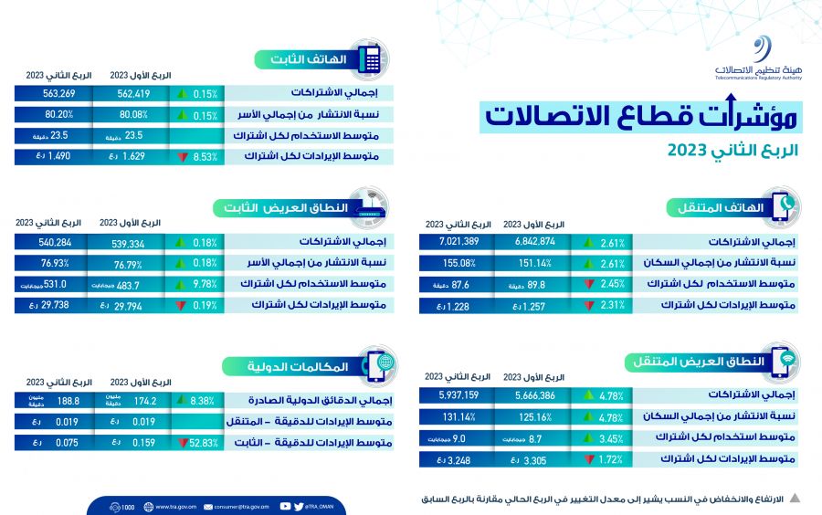 أصدرت هيئة تنظيم الاتصالات عبر موقعها الإلكتروني ومنصاتها الرقمية، مؤشرات قطاع الاتصالات للربع الثاني من العام 2023، والتي تضمنت أهم البيانات والإحصاءات للهاتف الثابت والمتنقل والنطاق العريض الثابت والمتنقل والمكالمات الدولية.