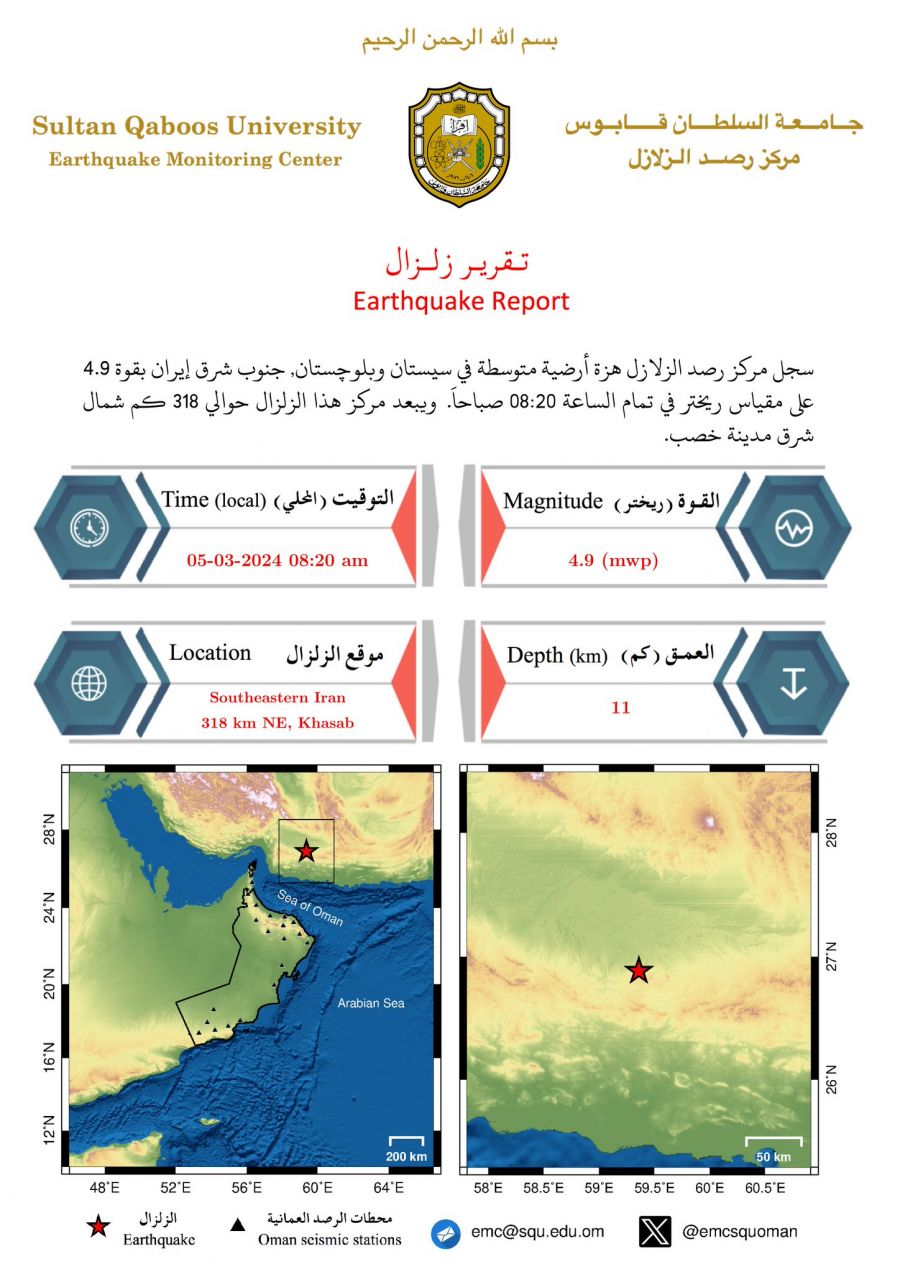 أفاد مركز رصد الزلازل بجامعة السلطان قابوس بتسجيل هزة أرضية متوسطة في سيستان وبلوچستان جنوب شرق إيران بقوة 4.9 على مقياس ريختر في تمام الساعة 08:20 صباحاً. ويبعد مركز هذا الزلزال حوالي 318 كم شمال شرق مدينة خصب.