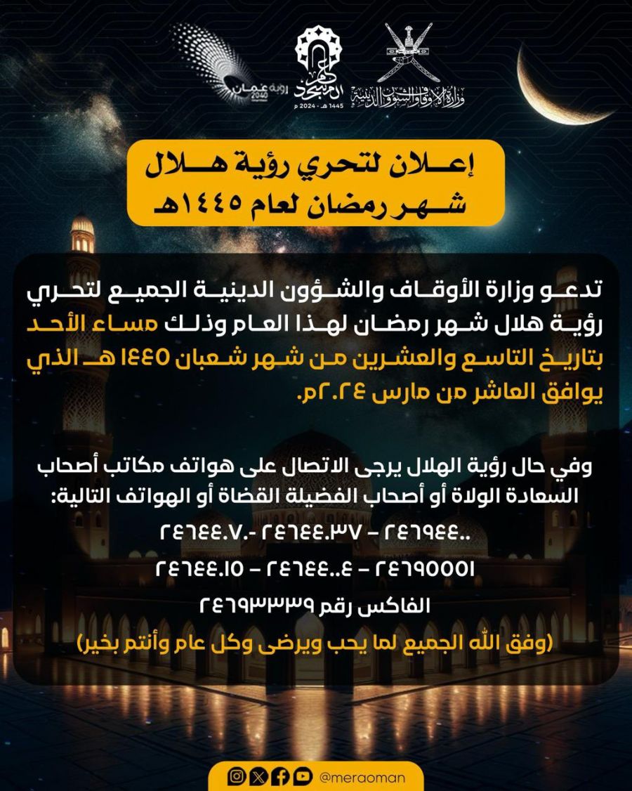وفي حال رؤية الهلال يرجى الاتصال على هواتف مكاتب أصحاب السعادة الولاة أو أصحاب الفضيلة القضاة أو الهواتف التالية: