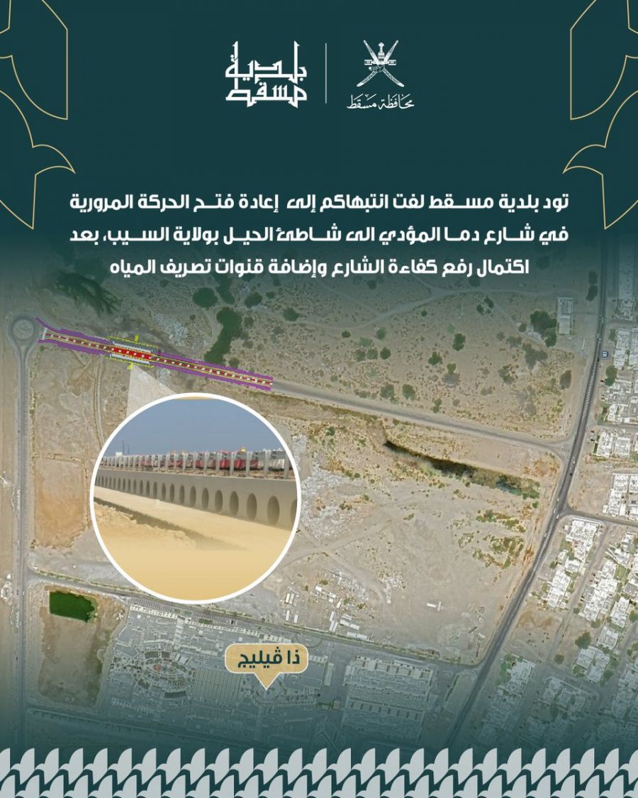 أعلنت بلدية مسقط  عن إعادة فتح شارع دمّا بـولاية السيب بعد إنجاز أعمال رفع كفاءة الشارع وإضافة قنوات لتصريف مياه الأمطار.