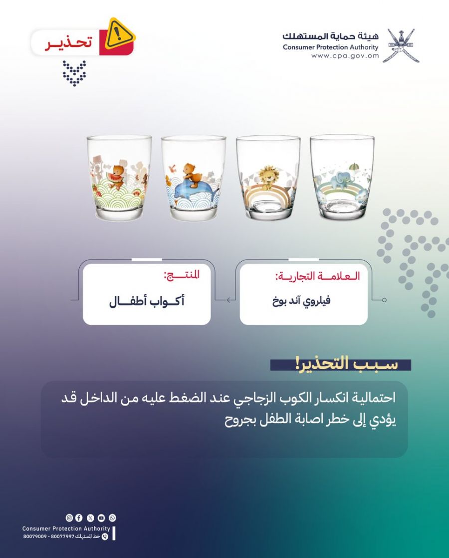 وقالت الهيئة في بيان لها : "حفاظاً على صحتك وسلامتك.. تجنب شراء أكواب أطفال للعلامة التجارية فيلوري آند بوخ من منافذ البيع الإلكترونية أو من خارج السلطنة".