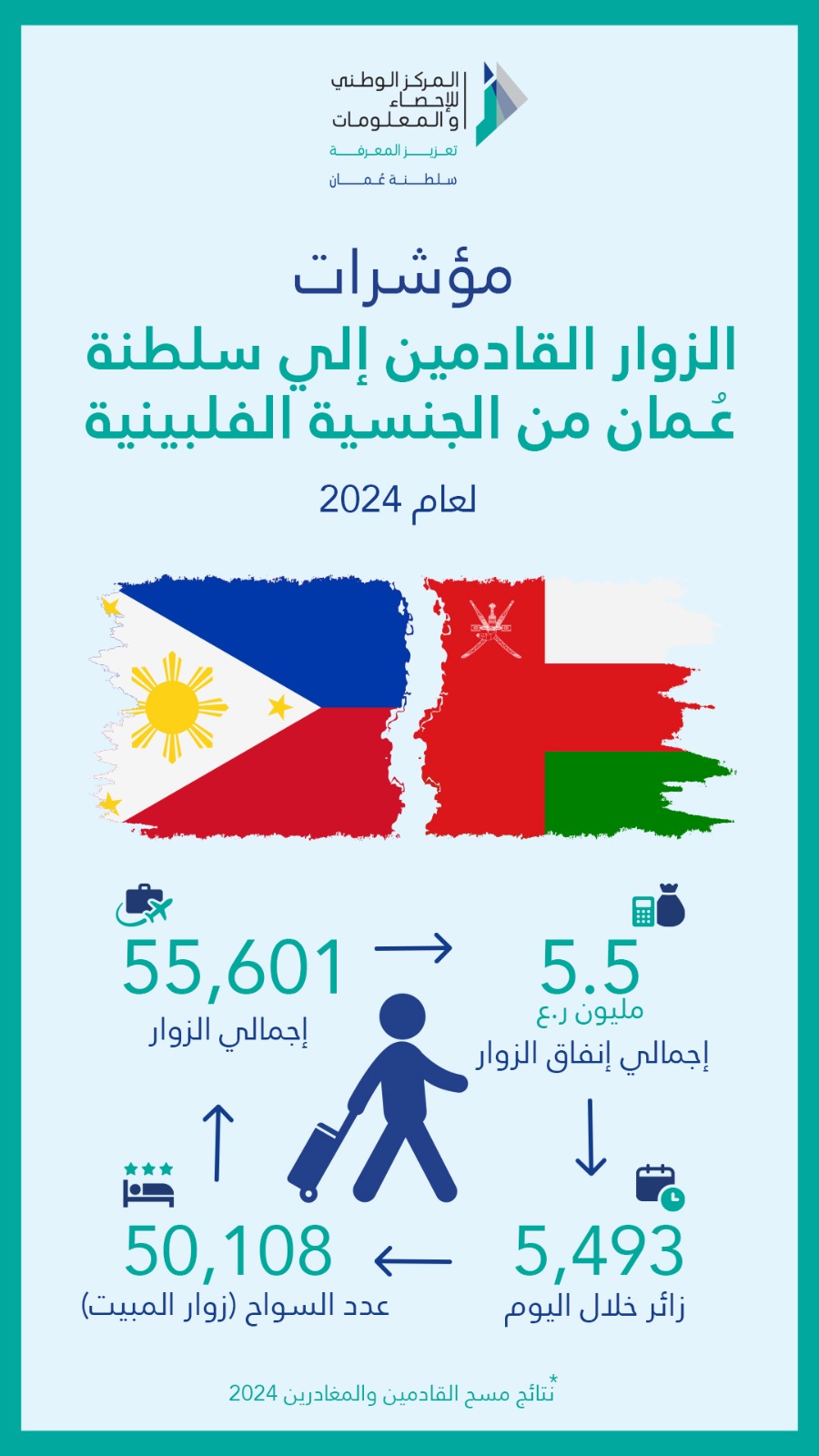 كشف المركز الوطني للإحصاء والمعلومات عن مؤشرات الزوار القادمين إلى سلطنة عُمان من الجنسية الفلبينية لعام 2024م، حيث بلغ إجمالي عدد الزوار الفلبينيين 55,601 زائرًا.