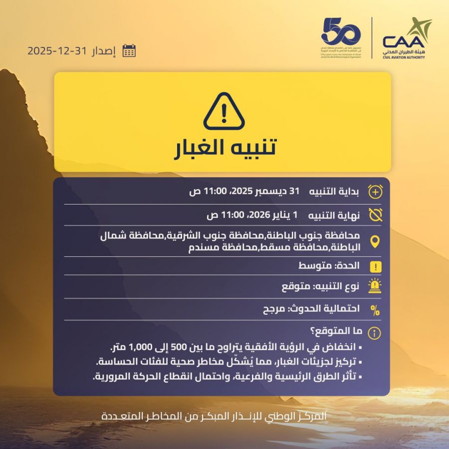 أصدرت الأرصاد الجوية العمانية تنبيه بالغبار المتوقع اليوم على محافظات جنوب الباطنة، جنوب الشرقية، شمال الباطنة، مسقط ومسندم، يؤدي إلى انخفاض الرؤية الأفقية مع احتمال انقطاع الحركة المرورية.