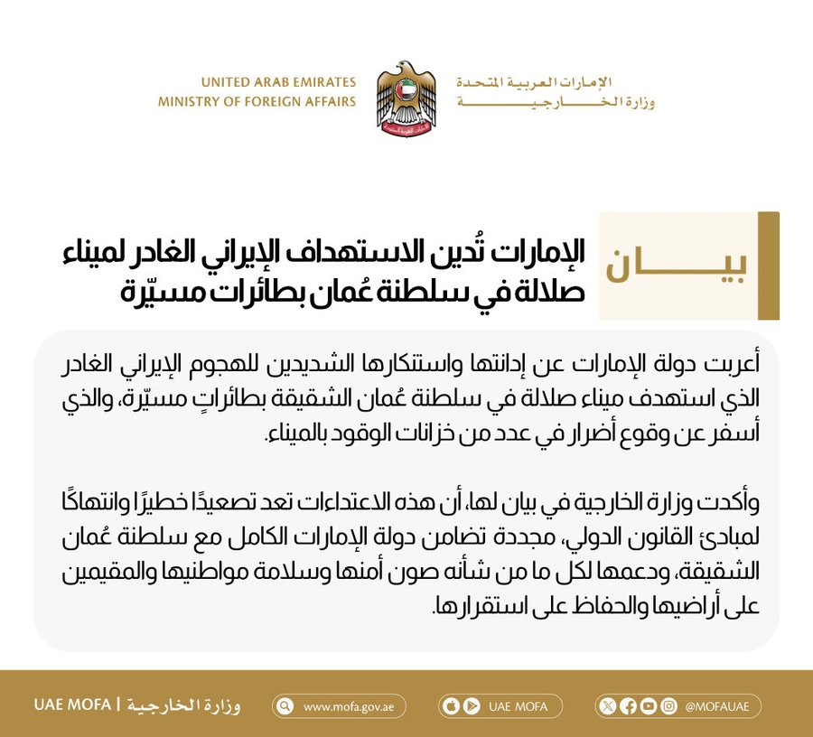 وأكدت وزارة الخارجية الإماراتية، في بيان لها، أن هذه الاعتداءات تعد تصعيدًا خطيرًا وانتهاكًا لمبادئ القانون الدولي، مجددة تضامنها الكامل مع سلطنة عُمان، ودعمها لكل ما من شأنه صون أمنها وسلامة مواطنيها والمقيمين على أراضيها والحفاظ على استقرارها.