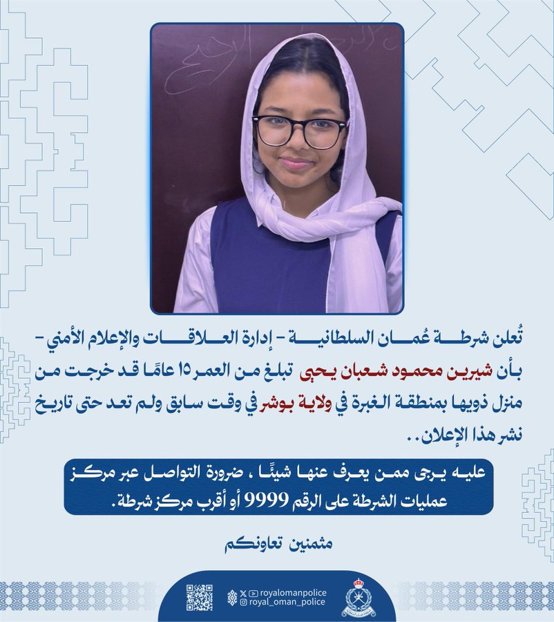 اعلنت شرطة عُمان السلطانية بأن شيرين محمود شعبان يحيى تبلغ من العمر ١٥ عامًا قد خرجت من منزل ذويها بمنطقة الغبرة في ولاية بوشر في وقت سابق ولم تعد حتى تاريخ نشر هذا الإعلان..
