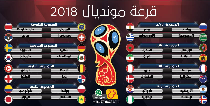 الجمعة ٠١/ديسمبر/٢٠١٧ ٢٢:٤٥ م تعرف على نتائج قرعة كأس العالم 2018 موسكو - ش في ما يلي مجموعات نهائيات كأس العالم لكرة القدم 2018 التي تنطلق في روسيا في...