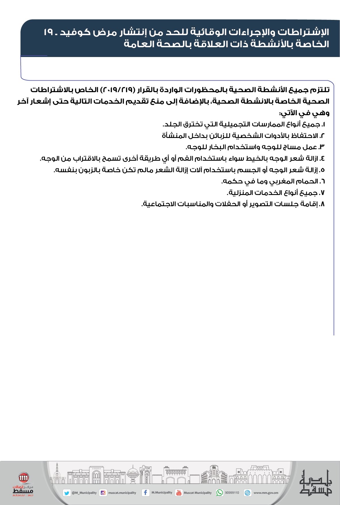الأربعاء ٢٦/أغسطس/٢٠٢٠ ٠٠:٢١ ص تنبيه: ضرورة إلتزام الأنشطة الصحية بتجنب المحظورات عند تقديم الخدمات ذات العلاقة بالصحة العامة مسقط – الشبيبة نبهت بلدية مسقط بشأن ضرورة إلتزام الأنشطة الصحية بتجنب المحظورات عند...