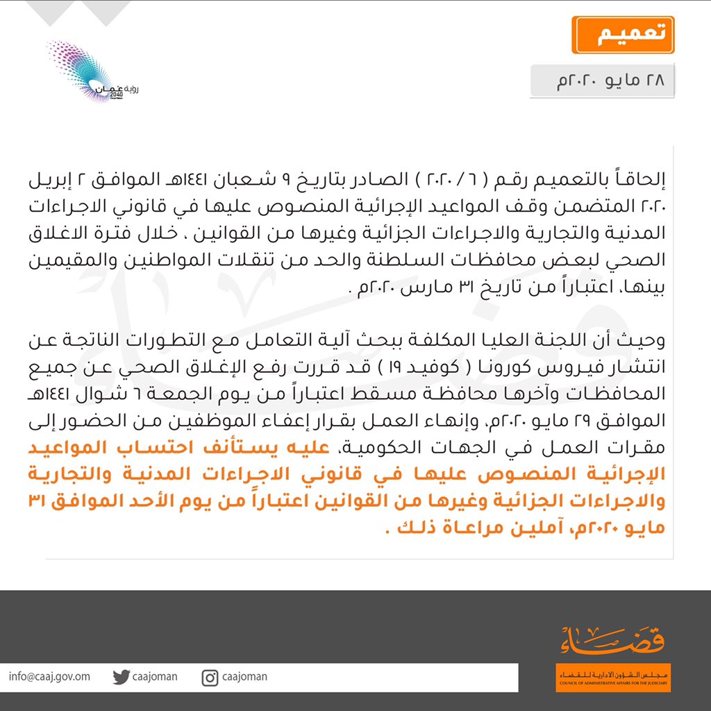 الخميس ٢٨/مايو/٢٠٢٠ ١٧:٤٤ م تعميم باستئناف احتساب المواعيد الإجرائية مسقط - الشبيبة أصدر مجلس الشؤون الإدارية للقضاء تعميم باستئناف احتساب المواعيد...