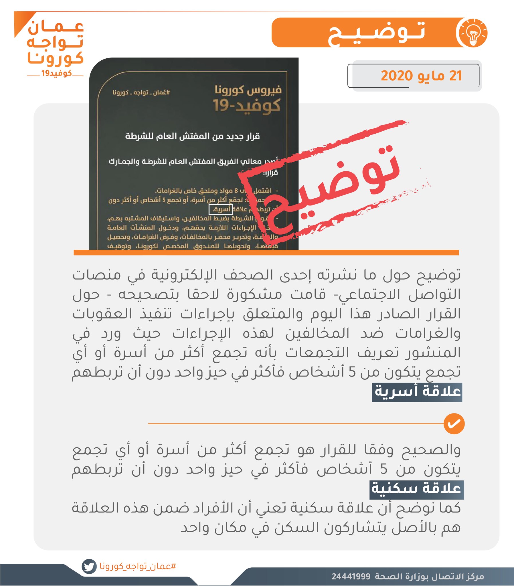 الخميس ٢١/مايو/٢٠٢٠ ١٩:٤٩ م "العليا" توضح حول آلية العقوبات على مخالفي الإجراءات مسقط - الشبيبة نشر حساب "عمان تواجه الكورونا" التابع للجنة العليا المكلفة ببحث...