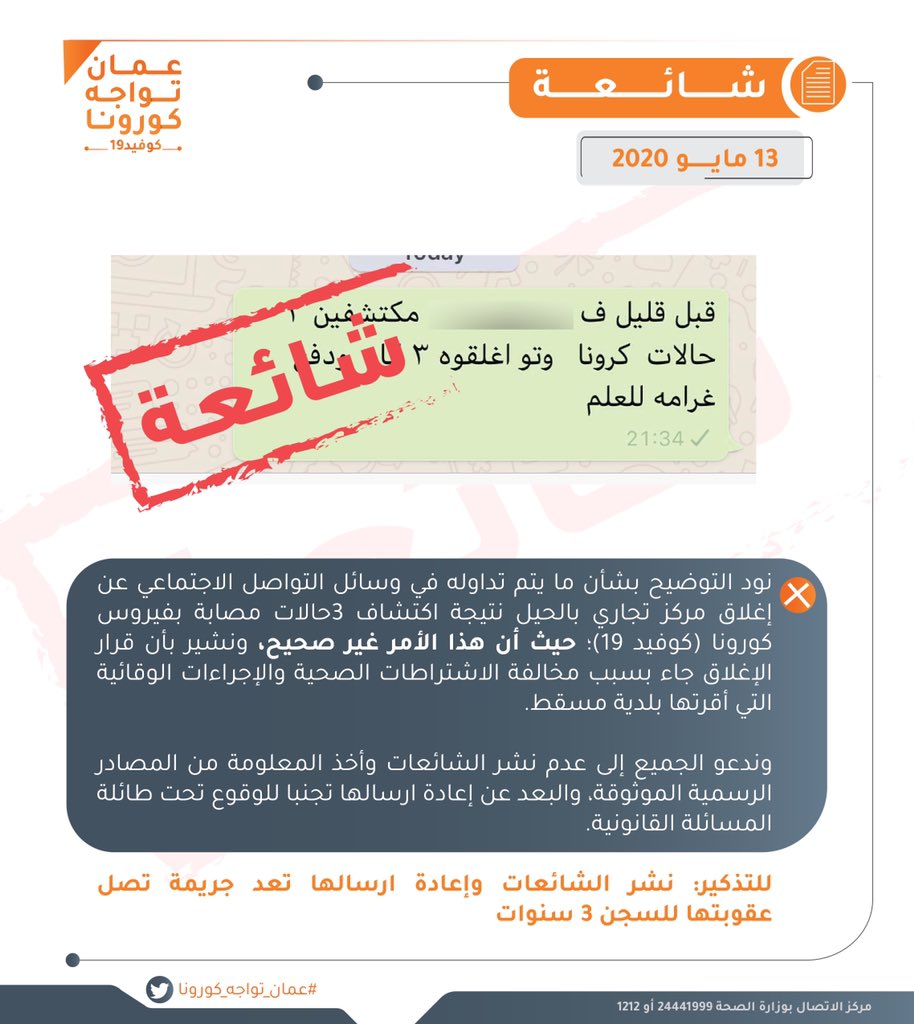 الخميس ١٤/مايو/٢٠٢٠ ٠٢:٠٢ ص "عمان تواجه كورونا" ينفي شائعة.. ويؤكد: عقوبة نشر الشائعات تصل لـ3 سنوات سجن مسقط – الشبيبة نفى الحساب الرسمي لـ"عمان تواجه كورونا" ما يتم تداوله في وسائل...