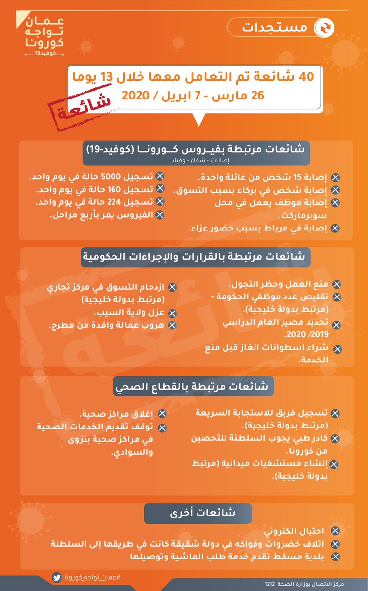 الأربعاء ٠٨/أبريل/٢٠٢٠ ٢١:١٨ م عمان تواجه كورونا ينفي 40 شائعة متعلقة بفيروس "كورونا" مسقط - الشبيبة نفى الحساب الرسمي لعمان تواجه كورونا في "تويتر" 40 شائعةً خلال 13...