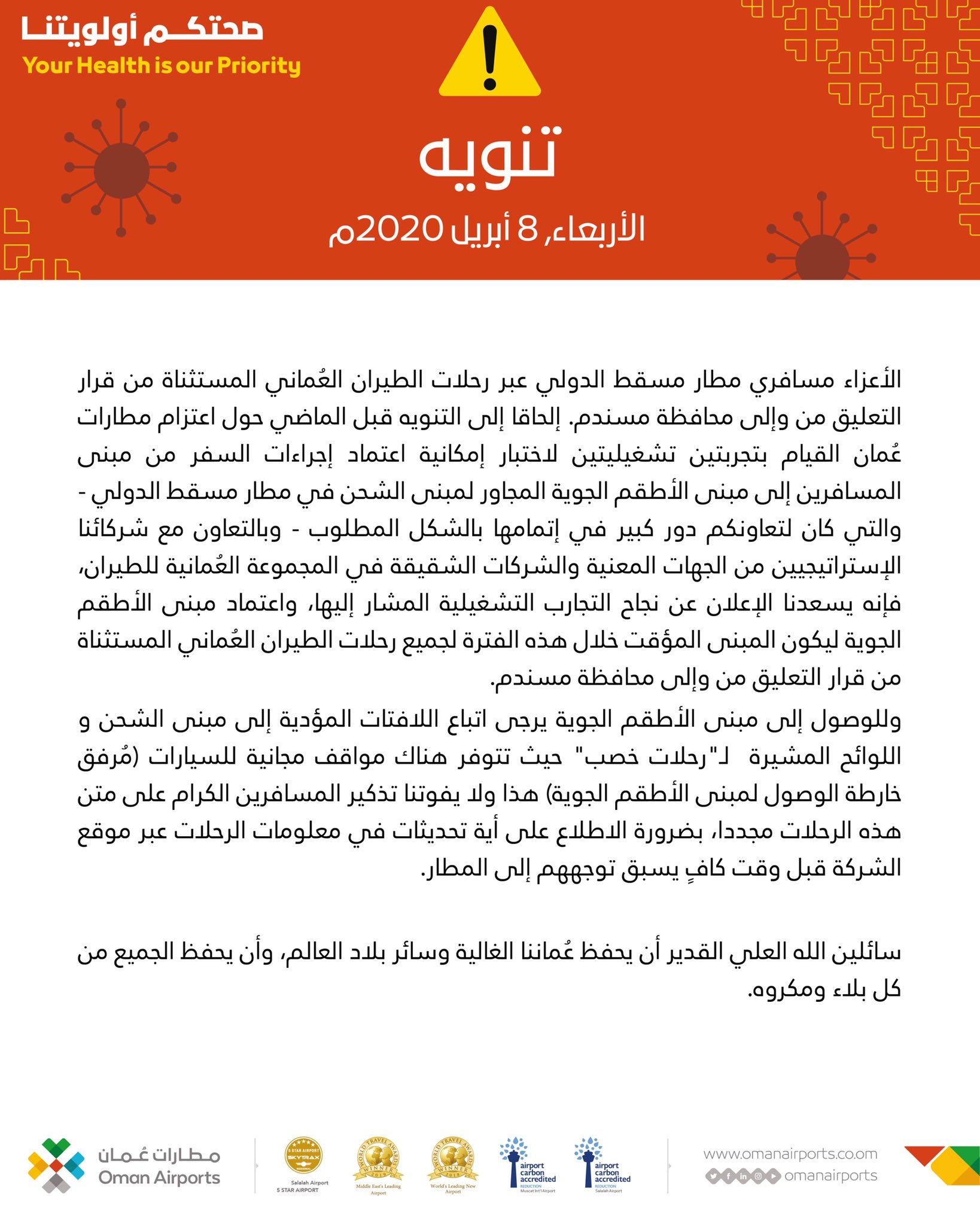 الخميس ٠٩/أبريل/٢٠٢٠ ١٢:٢٣ م اعتماد مبنى الأطقم الجوية لتشغيل رحلات مسندم مسقط – الشبيبة أعلنت مطارات عمان ، عبر صفحتها الرسمية في موقع التواصل الاجتماعي...