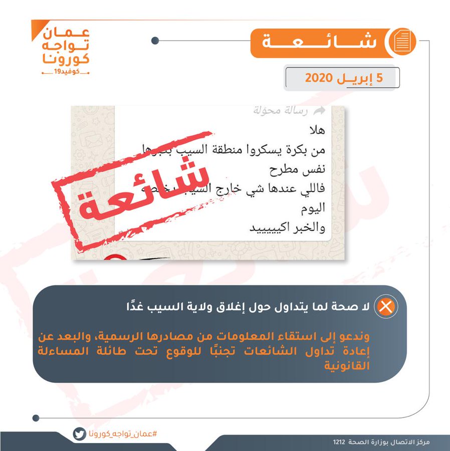 الأحد ٠٥/أبريل/٢٠٢٠ ١٩:١٣ م إغلاق ولاية السيب غدًا..شائعة مسقط - الشبيبة نفى الحساب الرسمي لعمان تواجه كورونا على "تويتر" ما يتم تداوله...
