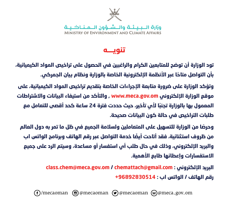 الأربعاء ٠١/أبريل/٢٠٢٠ ٢٠:٥٣ م إصدار تراخيص المواد الكيميائية "إلكترونيًا" مسقط - الشبيبة تماشيا مع الإجراءات الإحترازية للحد من انتشار فيروس كورونا...